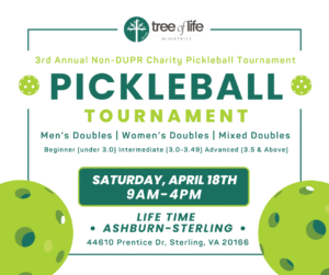 Play for a great cause during National Pickleball Month! Join us Saturday, April 18, 2026, at Life Time Ashburn-Sterling for Tree of Life’s 3rd Annual Non-DUPR Charity Pickleball Tournament. It’s going to be a fun, competitive day, with all tournament proceeds directly benefiting Tree of Life’s mission to help those in need in our community.